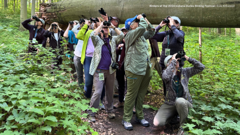 Photo: Manny Majorins, a young Indiana birder, smiles on a fall day wearing a shirt that says “ASK ME ABOUT” with a bird graphic and binoculars around his neck.