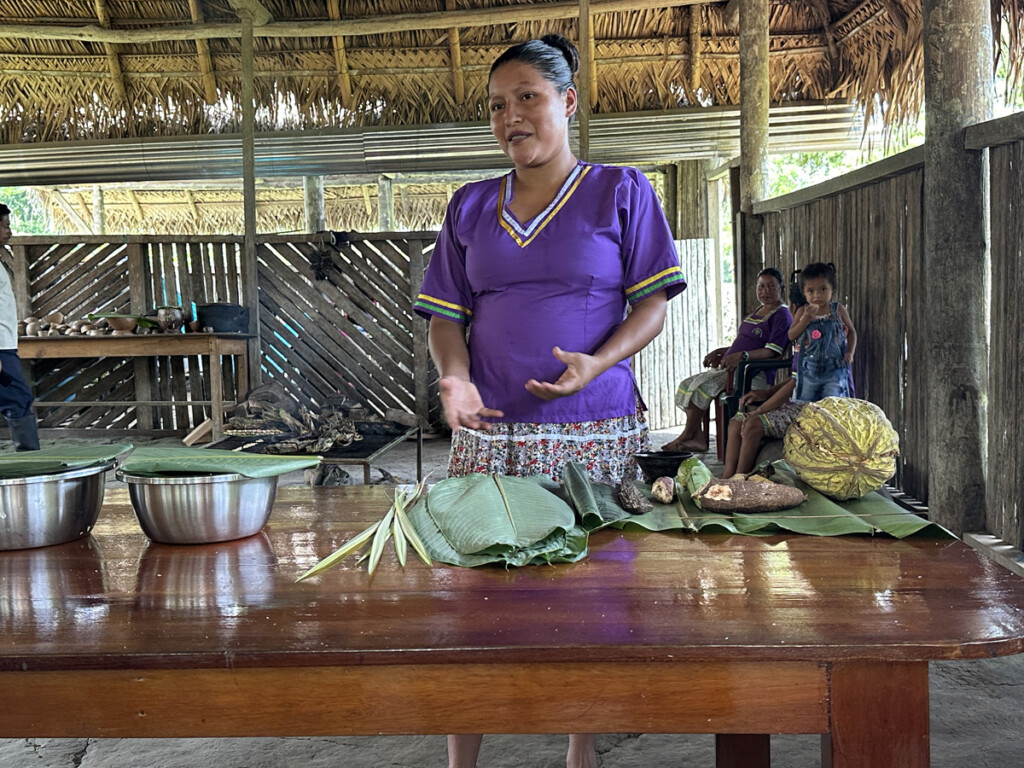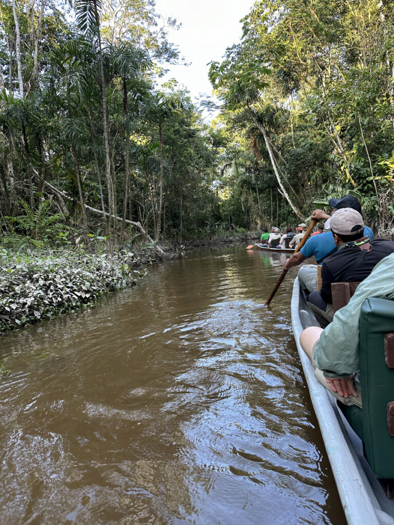 One of the reasons I enjoy traveling with Indiana Audubon is their commitment to contributing locally on each of their major trips. One such donation was made to the Sani Warmi Women’s Organization, which empowers the women of Sani Isla to run their own businesses by making and selling traditional handicrafts. This initiative creates new income sources and fosters economic independence for the women and their families, while also helping to protect 50,000 acres of the Amazon. We were able to visit this community of approximately 600 people and were treated to a traditional Kichwa lunch, featuring fish, plantains, and grilled grubs for the adventurous eaters in our group.