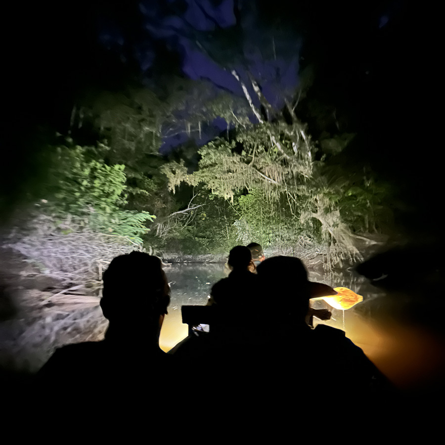 Photos: Looking for nocturnal creatures on the creek (top). White-eared Jacamar (bottom left), Long-billed Woodcreeper (bottom middle), and Hoatzin (bottom right). All by Jenny Young.
