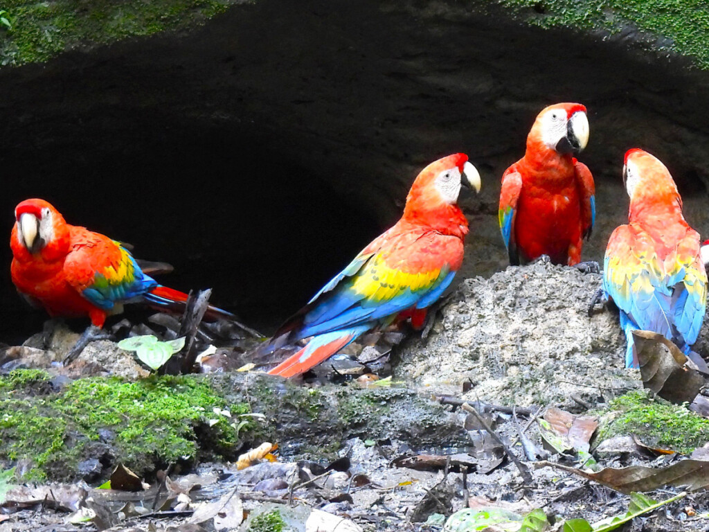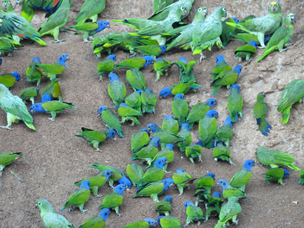 Photos: Blue-headed Parrots, Yellow-headed, and Mealy Amazons on the clay lick (left) and Scarlet Macaws (right) by Jenny Young.