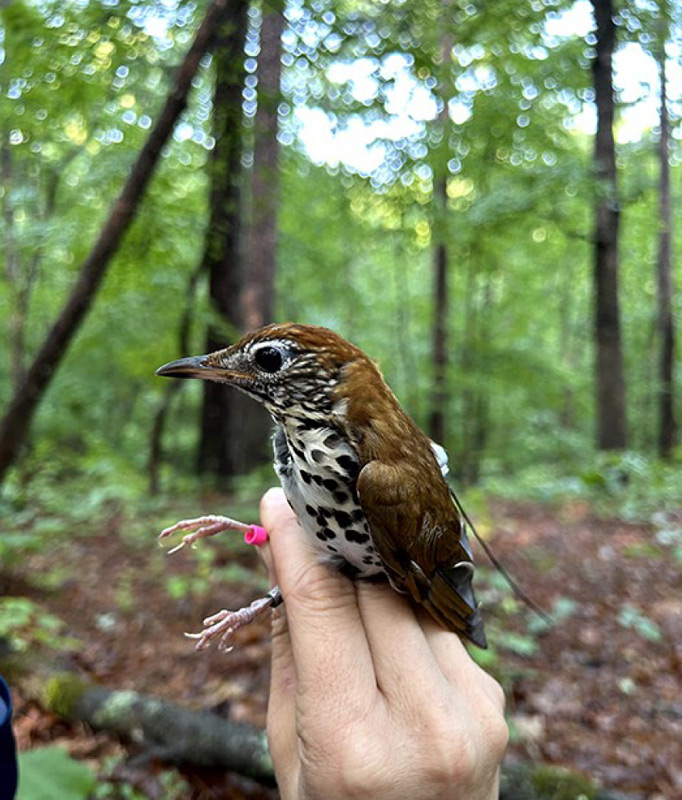 Photo: This Wood Thrush decoy was used to help lure Wood Thrush near an avian mist-net to capture birds for banding and Motus-tagging. Photo by Amy Tegeler/South Carolina Department of Natural Resources.
