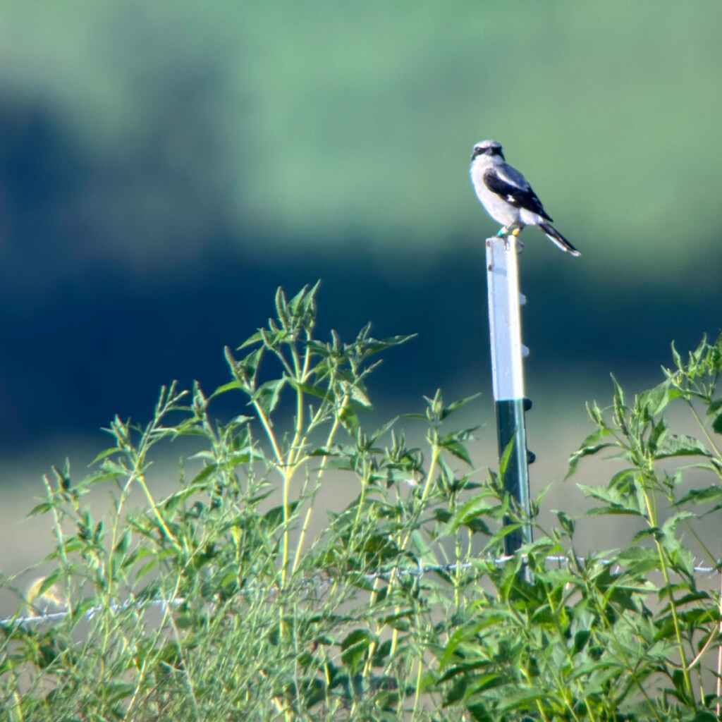 Photo Above: A Loggerhead Shrike keeps watch from a fencepost in southern Indiana. This digi-scoped shot, taken through a spotting scope by Amy Kearns this summer, highlights the bird’s masked profile against a summer-green backdrop.