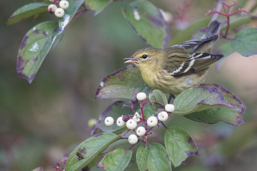 Photo: Blackpoll Warbler in fall plumage perched among dogwood leaves and white berries, bill open as it forages. Photographed by Ryan Sanderson.