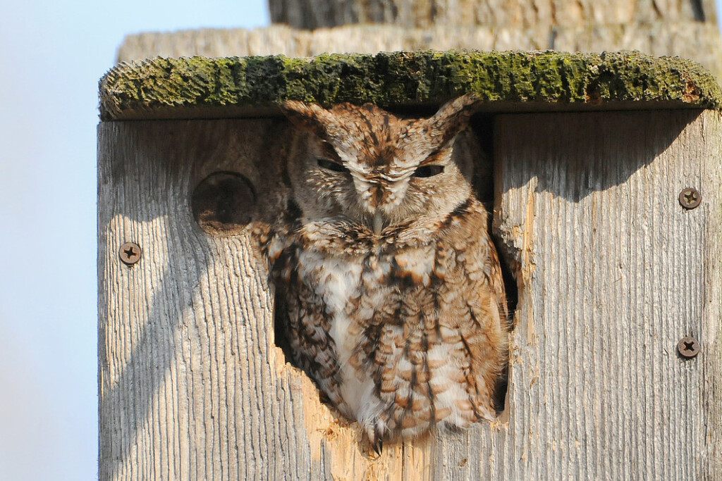 Photo: Eastern Screech-Owl resting in the entrance of a wooden nest box, blending into the weathered wood with its rufous plumage. Photographed by Joni James.
