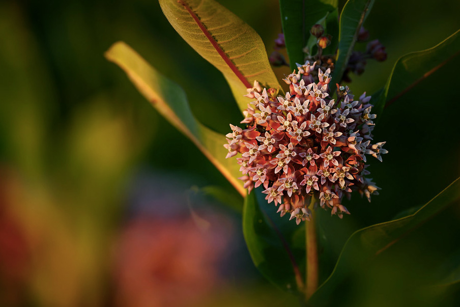 Photo: Cluster of pink Common Milkweed blossoms, highlighted in warm evening light, surrounded by broad green leaves. Photographed by Shari McCollough.