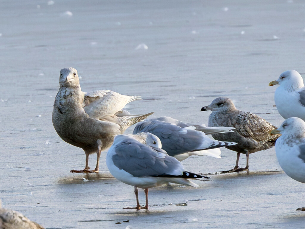 Image: Iceland Gull (middle behind the Ring-billed Gull) on ice next to a larger, pale Glaucous Gull (left), highlighting the Iceland’s gray primaries and large apical spots. Photo by Bill Sharkey.
