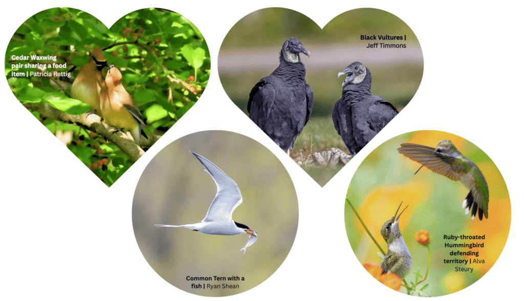 Image: Graphic featuring four bird photos arranged in heart and circle shapes on a light background: a heart-shaped image of a Cedar Waxwing pair sharing a food item (photo by Patricia Rettig); a heart-shaped image of two Black Vultures standing together (photo by Jeff Timmons); a circular image of a Common Tern in flight carrying a fish (photo by Ryan Shean); and a circular image of a Ruby-throated Hummingbird defending its territory, wings spread near flowers (photo by Alva Steury). Graphic created by Olivia Bautch.