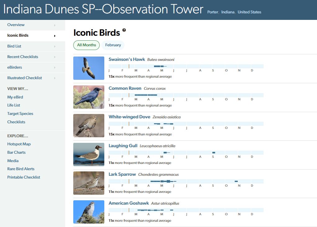 The Observation Tower is more than a place to add numbers, it’s a vantage point for stories. eBird’s new Iconic Birds list for the tower highlights species that occur there at higher rates than the regional average, and that pattern changes across the three spring months. In March the tower often reads like a waterfowl and early-raptor station, with big scaup and merganser pushes and signature early-season visitors such as longspurs and horned larks. April brings the first real taste of songbird migration, with rising totals of swallows, kingbirds, and the first trickles of warblers. By May the tower is in its prime for warbler diversity, swallows on the move, and big blackbird flights, plus the raptor and gull movements that make the lakeshore unique. That three-month arc, from waterfowl and winter holdovers to a full-on spring chorus, is why the tower matters as a migratory hotspot. If you want to explore the species that show up most often at the site, check the tower’s Iconic Birds page on eBird: https://ebird.org/hotspot/L2091564/iconic-birds