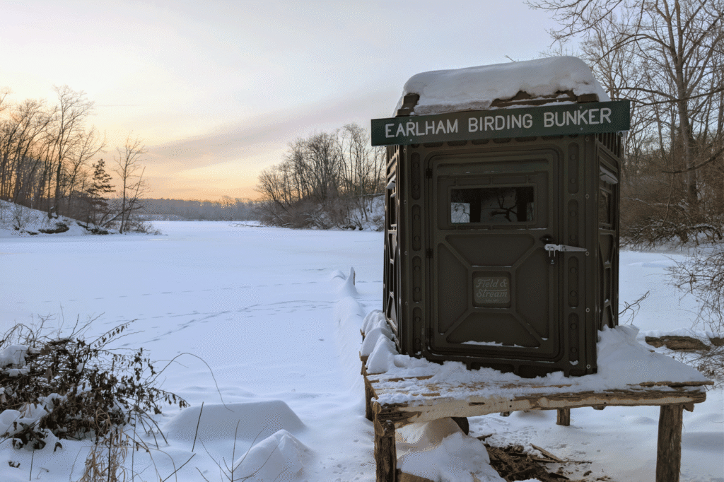 Image: The new blind in the snow, with a sign reading, “Earlham Birding Bunker.” Image courtesy of Richmond Parks and Recreation.