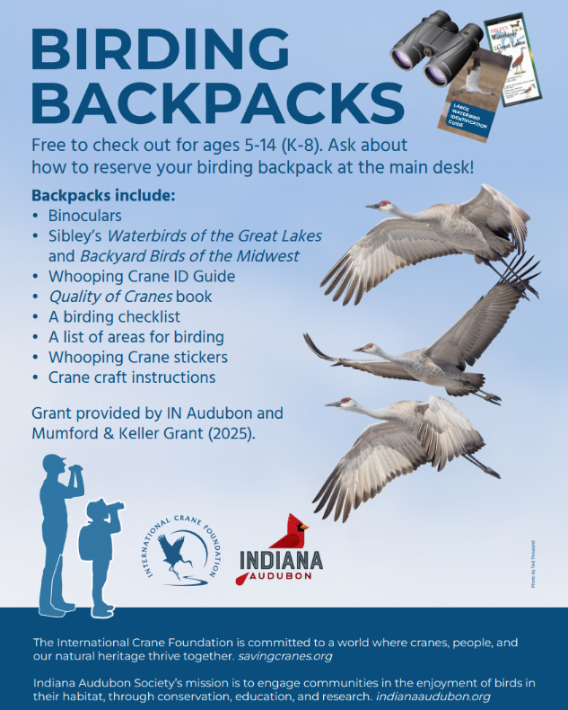 The Birding Backpacks are an important part of ICF’s broader outreach efforts to connect people with cranes and the wetlands they depend on. By helping children experience cranes and other birds in their habitats firsthand, we hope to inspire curiosity, appreciation, and long-term stewardship among young Hoosiers.
