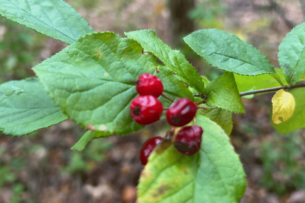 Image: Close-up of Christmas berry (Pourthiaea villosa) branch with small clusters of bright red berries and green leaves in a woodland setting. Photo by Mary Gray Bird Sanctuary Land Steward Alex Warchol.