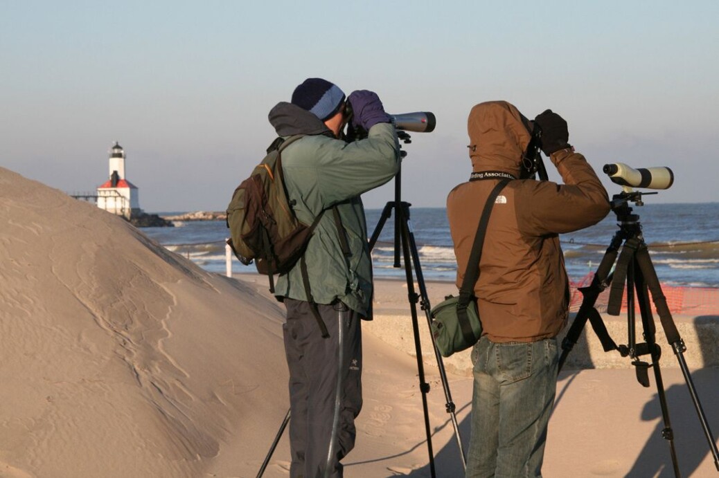 Image: Peter Grube and Jeff McCoy birding at Michigan City Harbor along Lake Michigan in the 1990s. Photo by Kenneth Brock, courtesy of Brad Bumgardner.