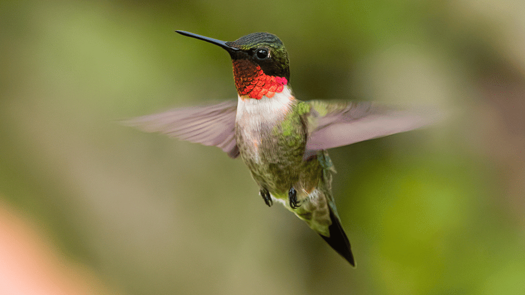 Image: Close-up of a male Ruby-throated Hummingbird hovering, wings outstretched and throat glowing red. Photo by Jason Jablonski.