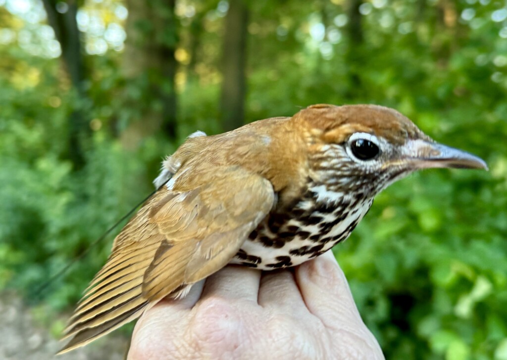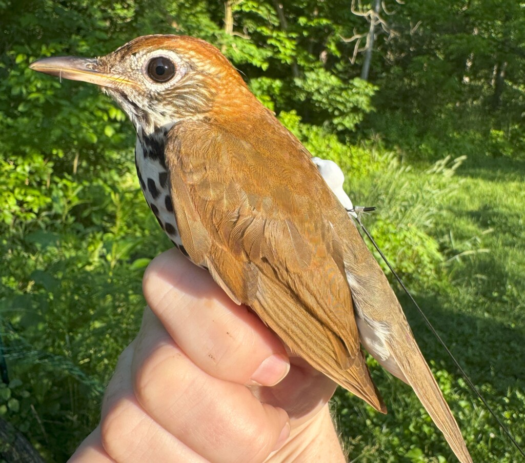It’s been a busy few weeks as our team continues to slog through a hot and humid summer, and our birds start to quiet down. Our team netted seven new Wood Thrushes in the last couple week. However, none have had the added heft needed to carry a transmitter, so three tiny “backpacks” are still waiting in a Ziploc, ready for the right birds. The season is winding down and that is normal. Any tags deployed from here on out are bonus datapoints. If they stay unused, we will ship them south for a winter deployment in Mexico, giving us a fresh angle on migration.
