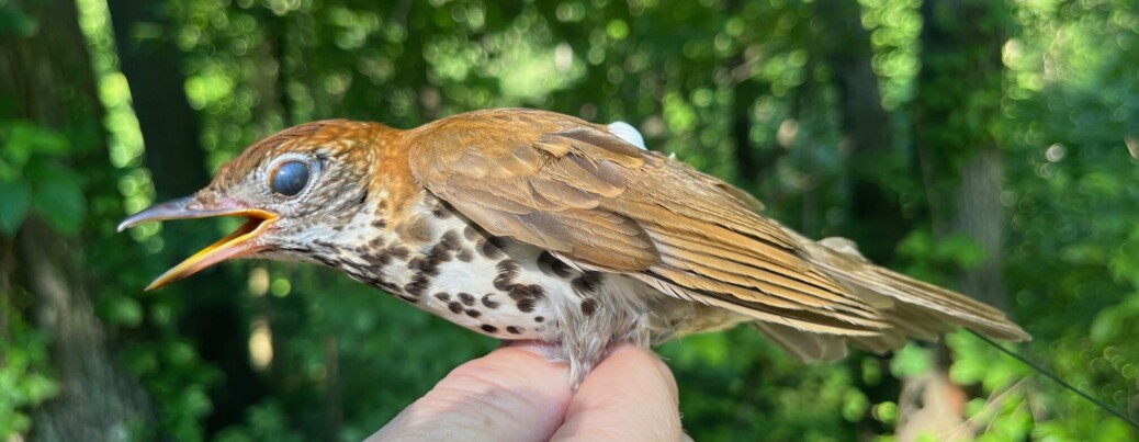 You can watch this story unfold in real time. “Chasing Melody in the Field” sessions put you shoulder-to-shoulder with our researchers as they track banded Wood Thrushes by radio telemetry. These sessions are timed with evening roosting movement of our already tagged Wood Thrush. The first two dates are posted, and help support the Chasing Melody project.
