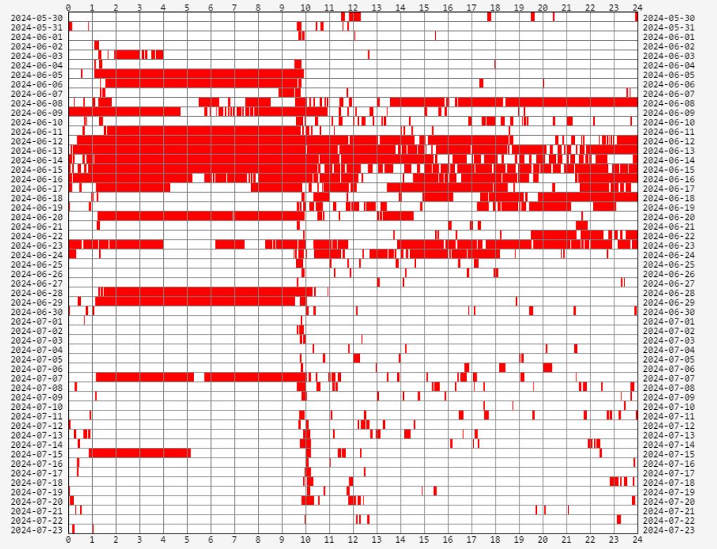 For us in Indiana, it’s been fun to see how long they stay before they begin their migration. Take 3231-00503 for example. “Kevin” as he came to be known, was banded at Mary Gray Bird Sanctuary in May, as our first project bird. As of yesterday, he was still palling around at MGBS. The red timeline below shows each detection we have had with Kevin and the Motus tower antenna at MGBS. Want to adopt Kevin, or any of the other Wood Thrush, consider visiting our Adopt a Wood Thrush page to learn more.