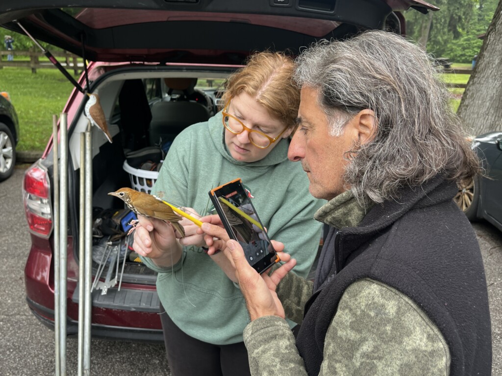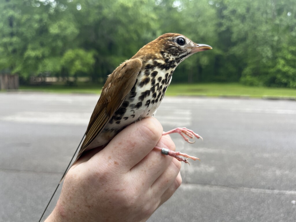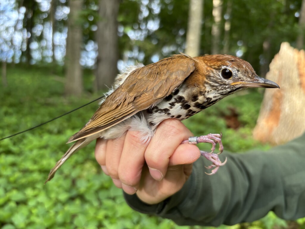 Despite the rain, muddy trails, and more than a few low-hanging branches, our Chasing Melody team has been busy in the woods chasing the flute-like song of the Wood Thrush. With nets in tow and coffee in hand, we have banded and tagged 8 Wood Thrushes so far this season. Each banded bird represents a small triumph and a big step toward understanding this iconic species.