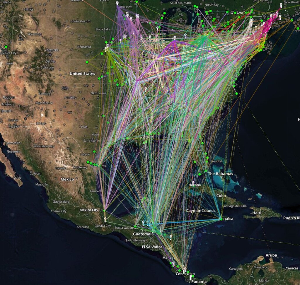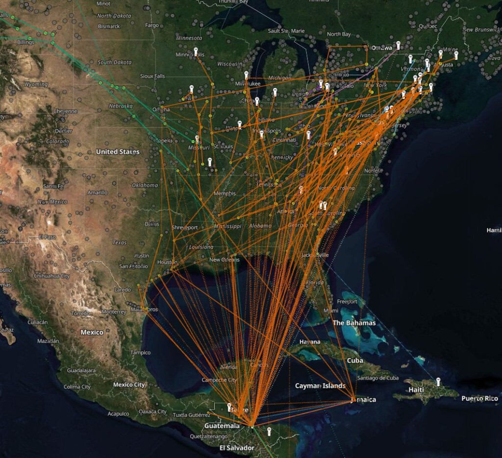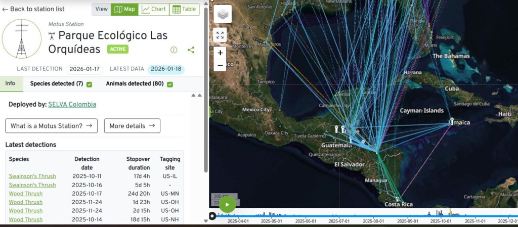 One of the strongest windows into fall migration now sits right in northern Honduras, thanks to the two Motus stations installed earlier this year at Pico Bonito and Jardín Botánico Lancetilla by the Sam Shine Foundation.. The Lancetilla station is the same one that just detected Willow. That single tower pulls in traffic from a long list of migrants, and when you zoom out to see what hits it each fall, it looks like someone spilled a rainbow across Central America.