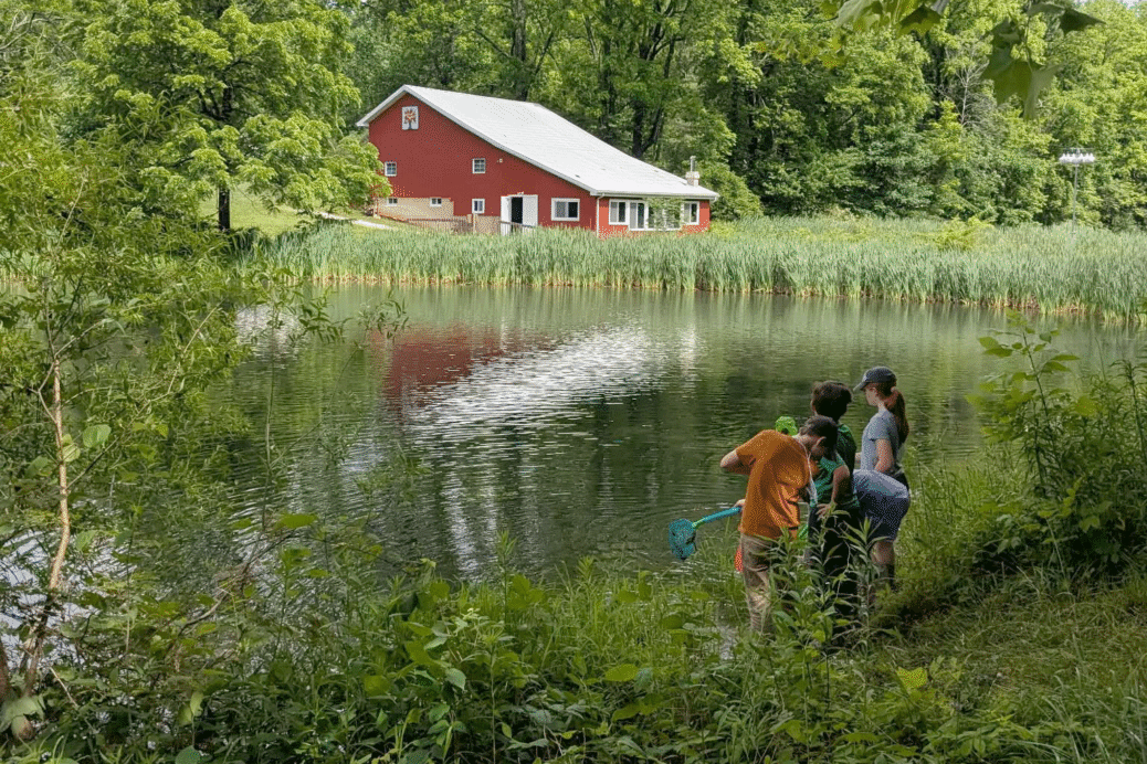 Image: Youth exploring one of the fishing ponds near the Markle Barn at Mary Gray Bird Sanctuary. Photo by Libby Keyes.