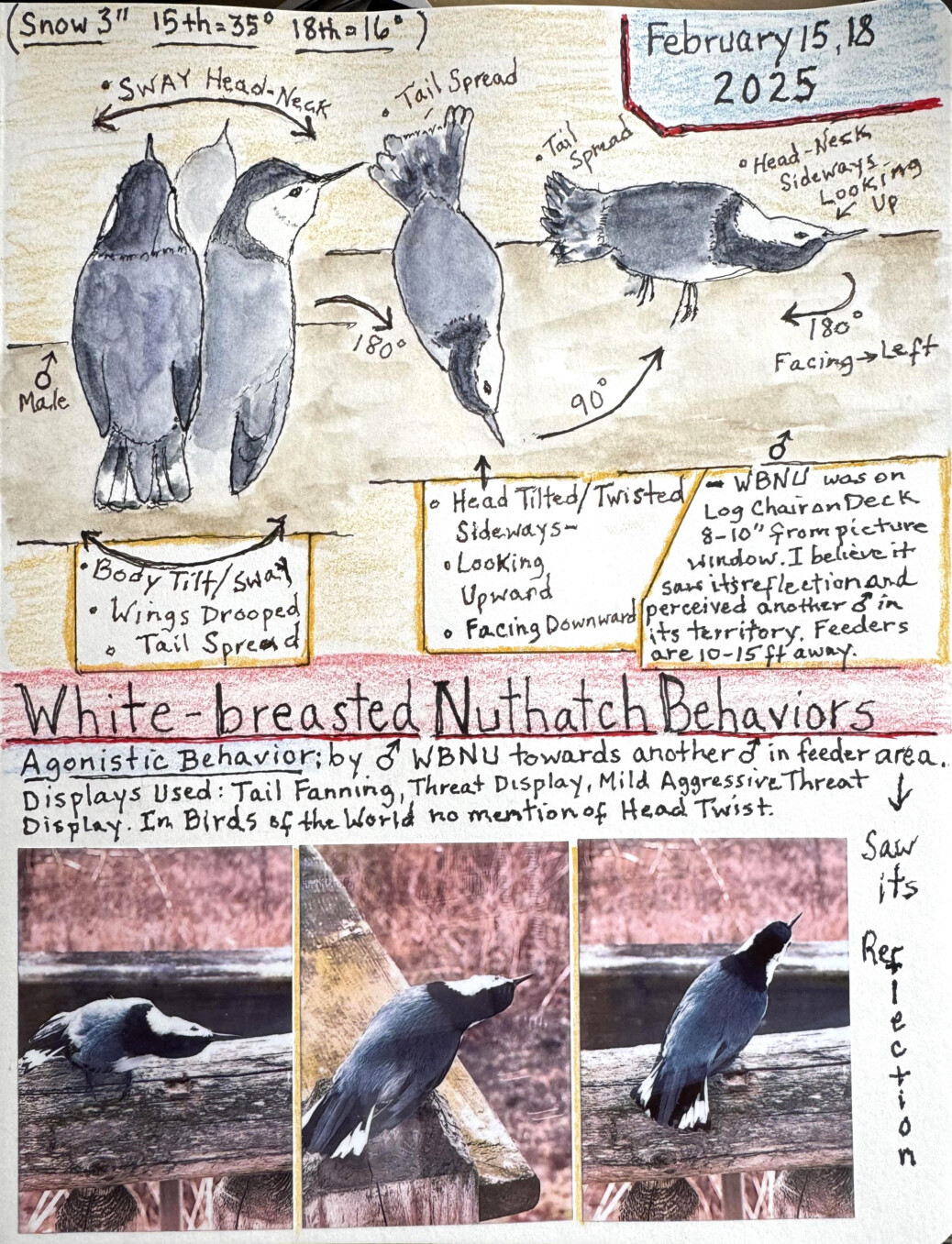 This male White-breasted Nuthatch saw his reflection in my window and began giving a behavioral response. He was six to eight inches from my window. The displays are agonistic behaviors/displays performed towards a competing male (he perceives) in his feeding (and potentially) breeding territory. Note the tail spreading, wing drooping,...